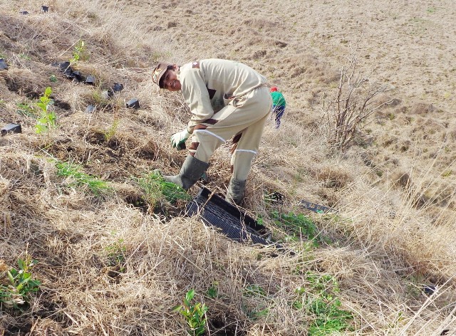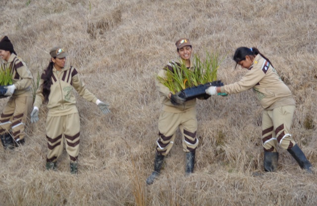 On particularly steep sections, the team used a human chain to get the plants from the road to the planting site.