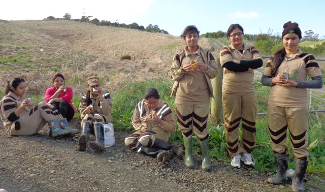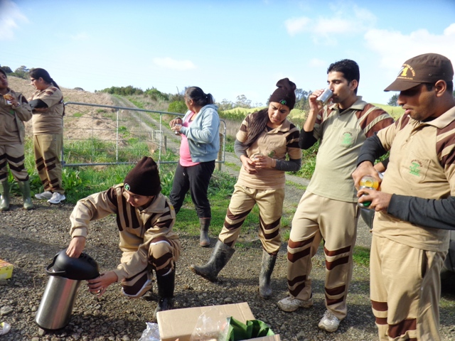 The hard working team took their midday tea break in the field.