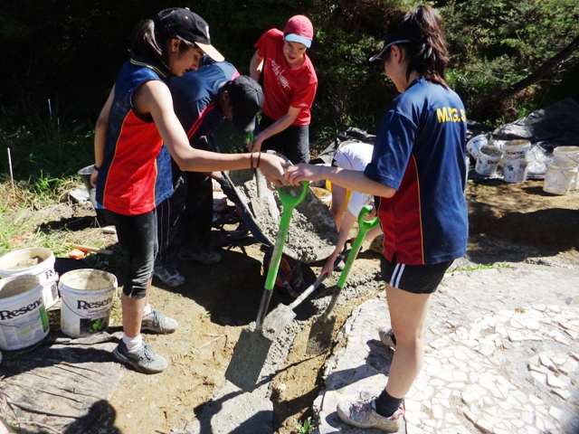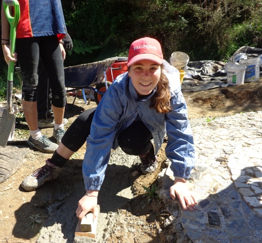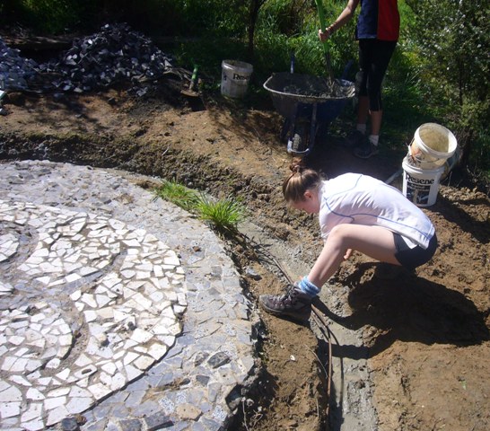 Last year a team started a large mosaic of the DoEHA logo at one of the entrances to the Grove.  They had finished the main part of the mosaic and subsequent groups have done additional maintenance work.  The current plan is to finish off the mosaic by securing it with a brick frame and doing some additional stone work around the perimeter.  The team in July had dug out the foundation for the brick frame and this team lined the frame with concrete to form a base for the bricks which will be laid next year.