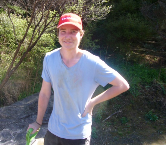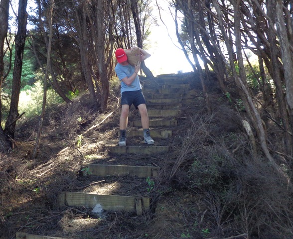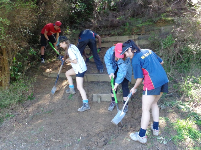 After lunch we started out with some maintenance work.  Previous teams have built a walking track through the Grove and it requires regular maintenance, especially after wet winter weather.  The group spread out along the track and trimmed away vegetation, smoothed out rough spots and improved some areas to make them safer.  The work included cutting some new steps and boxing them up.