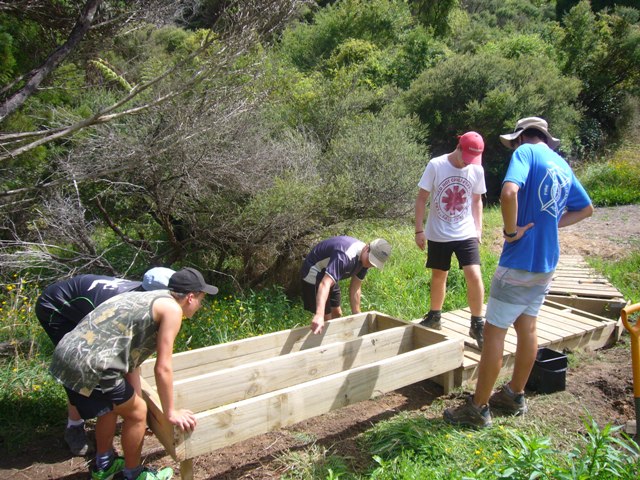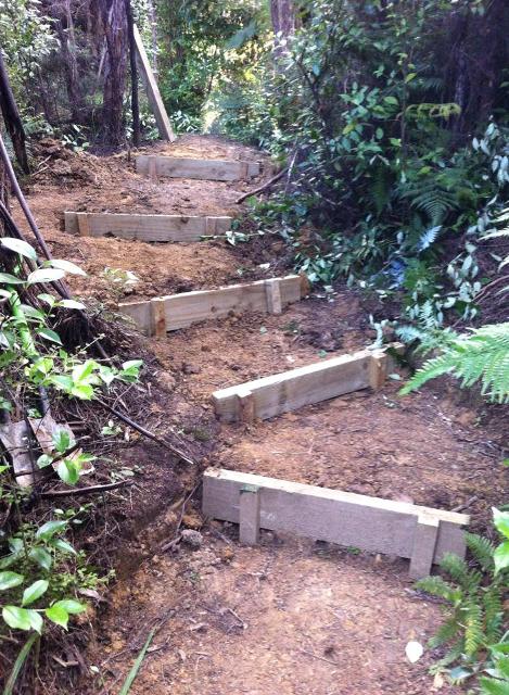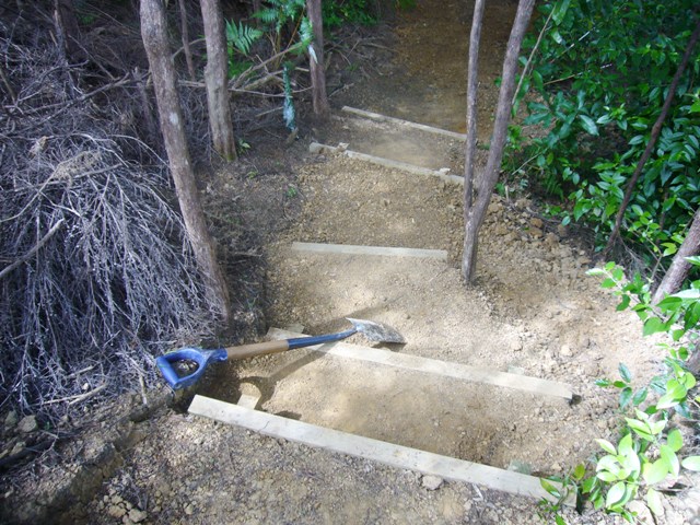 Previous teams had shaped the track and cut steps on steep sections. It was necessary to box in the steps with boards and pegs. The first task was to measure and cut the timber.