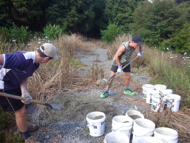 The final task on the track was to spread some gravel on the surface to make it safe for year round use. This involved collecting gravel from a pile near the top of the property into buckets.