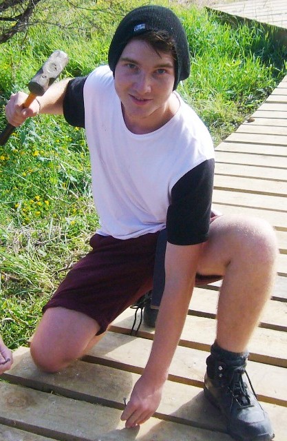 Kalym worked with Doug, Ellis, Harry and Howard to build the boardwalk sections. The first task involved studying the terrain and figuring out the best route and measuring to determine how much timber would be required.
