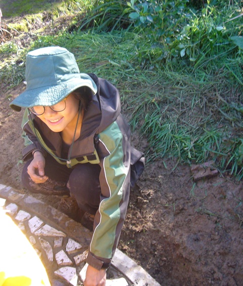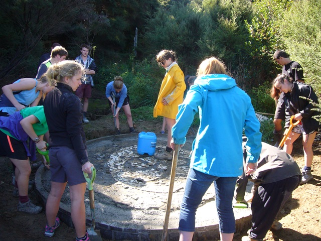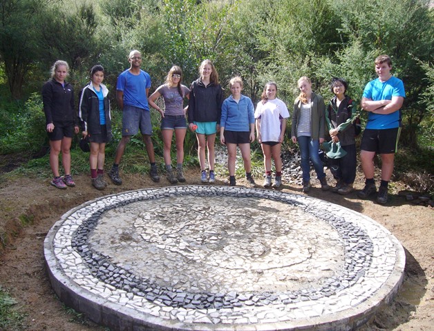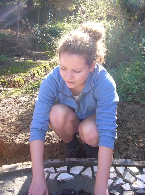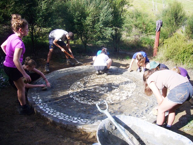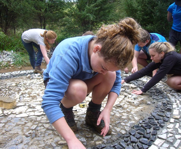 In October 2013 a gold award team started a mosaic of the DoEHA logo to welcome visitors to their Grove at CUE Haven. Subsequent teams have added to the mosaic but unfortunately, over time erosion and ground movement have taken their toll on it. We decided to stablise the mosaic by building a brick wall around it and then filling in the circle to complete the mosaic. An earlier team had put down a concrete base in the circular area to be filled and a brick wall was constructed and it was the job of this team to complete the work.