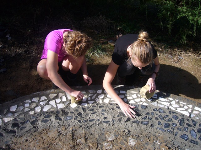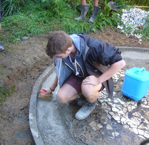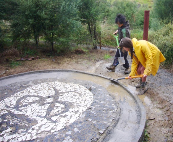 They then mixed up more concrete and spread it out in a thin layer that the mosaic tiles would be set into. It was a challenging job to match up the irregularly shaped tiles and get everything even but the end result looked good.