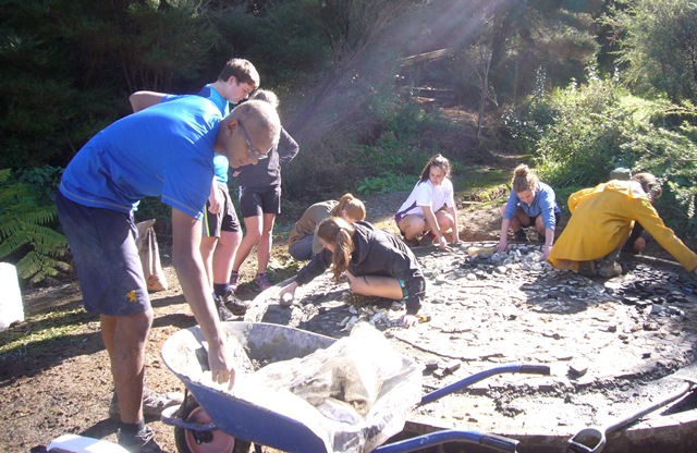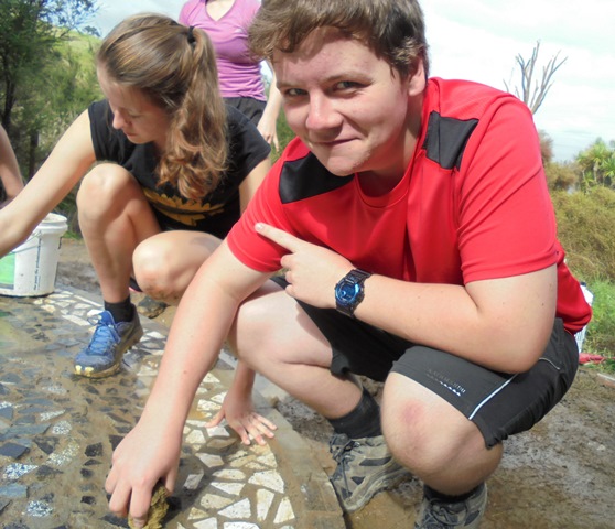 The team tackled a variety of tasks during the week. They spent most of their time and effort finishing up the mosaic of the DoEHA logo in the Grove and also did walking track maintenance, fence repair and maintenance, planted some trees, did some weeding and they also painted some of the totem poles that previous teams had carved. It was a busy week and we had to be flexible because the weather was very changeable and we had to work around the cloudbursts.