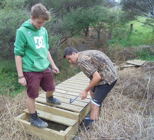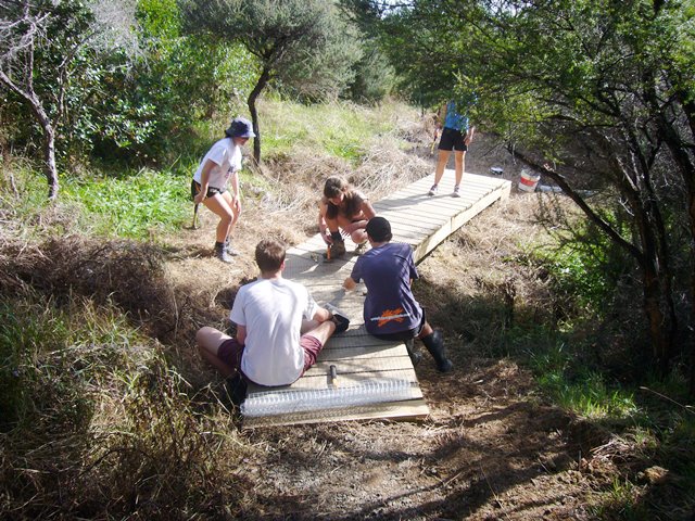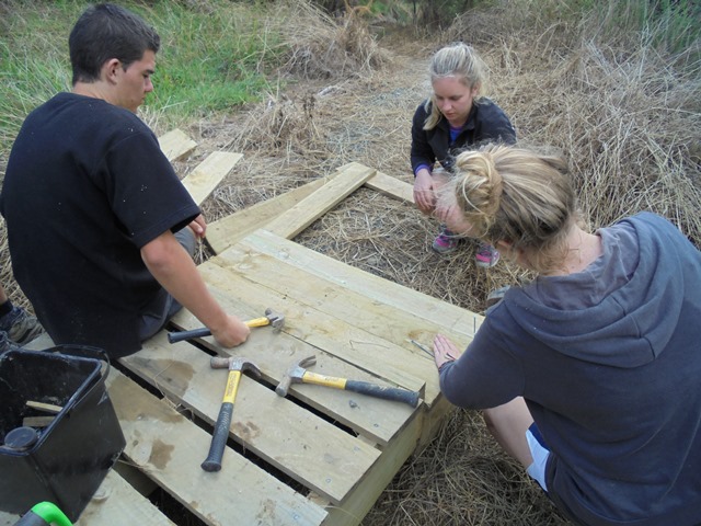 An earlier team had installed some boardwalk sections on a wet section of a new track and some of the joints between the boardwalk sections were incomplete. The team went to work to fix the sections and also finish off the boardwalks by putting down wire mesh to make them safe to walk on in all kinds of weather.