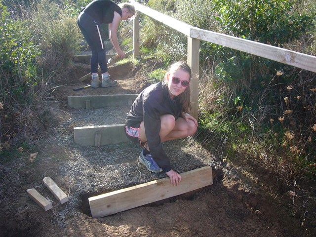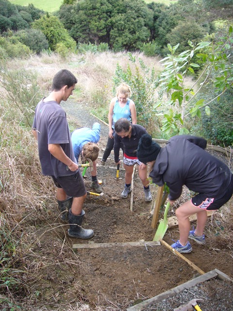 The last and most challenging bit of track work involved redesigning and rebuilding some steps on three sections of the track. Because of ground movement and settling, some of the steps have gotten quite deep and they were becoming difficult to navigate. The team studied the problem and came up with solutions which involved either reforming existing steps or putting in additional steps. The result is a great improvement.