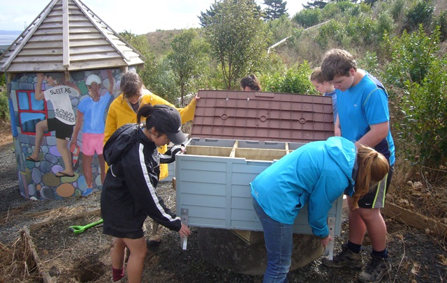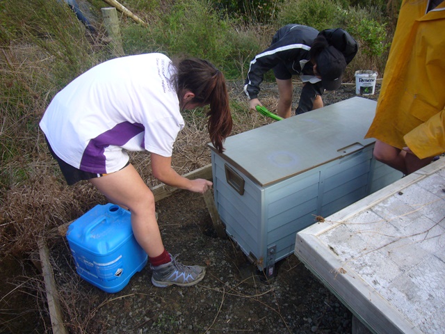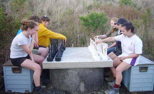Earlier teams built a chessboard and a set of chess and checker pieces. The chessboard is located behind the hut which was built from the old water tank near the top of the property. In order to provide secure storage for the pieces as well as a place for players to sit, we acquired two storage boxes and an earlier team reinforced them with timber. This team tackled the job of securing them in position by the chess board.