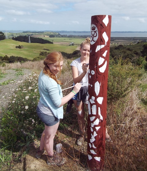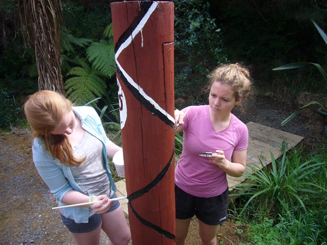 Earlier teams have been carving totem poles to mark the entrances to the walking tracks they have built. The earliest poles were painted a solid colour and we decided to use some white and black paint to fill in the carved areas so that people could more easily see the interesting carving work.