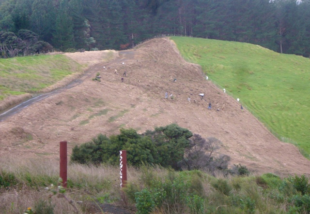 Today’s planting had the additional challenge of being on a remote part of the property. As a result we had to shuttle the team, plants and equipment up in small groups. The planting site is the brown area near the top of the photo below.