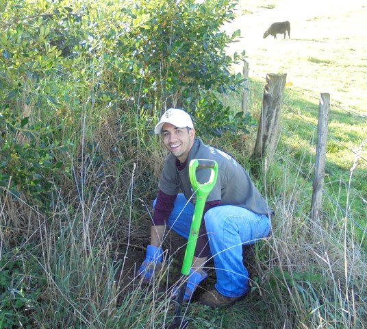 The team continued working until that area was completely planted. We then moved up to the top of the property and to the main area being planted this year. The area is brown because to prepare the site for planting earlier in the year, we had sprayed the pasture to kill the introduced kikuyu grass which is an invasive weed and undesirable in restoration projects.