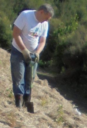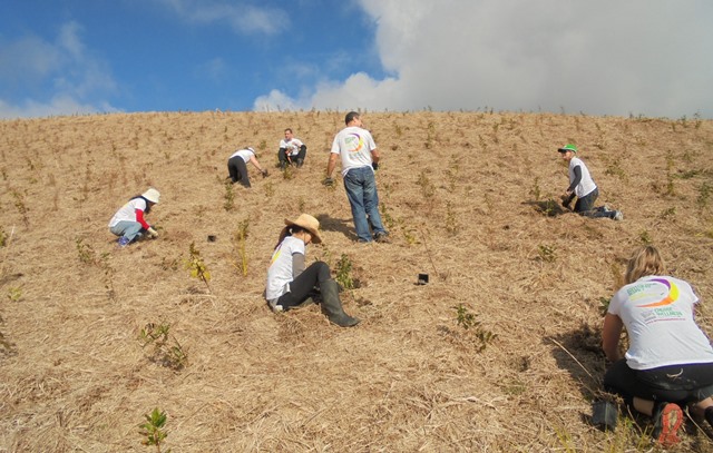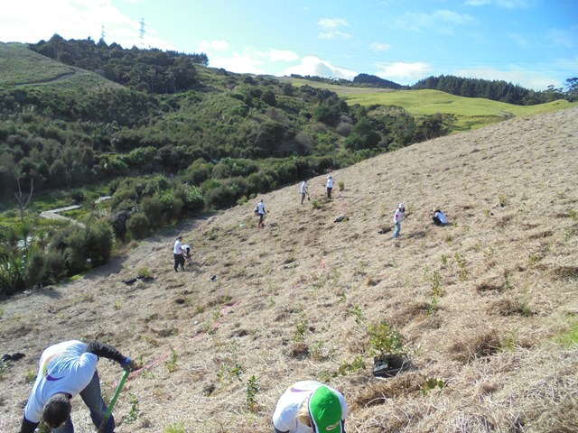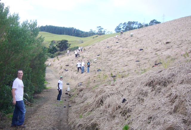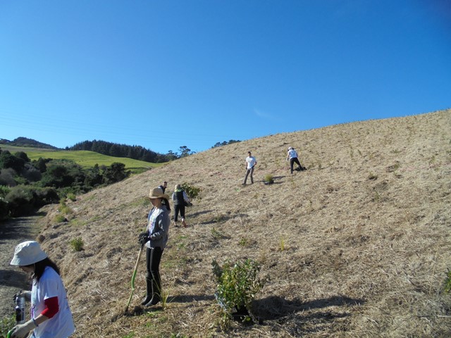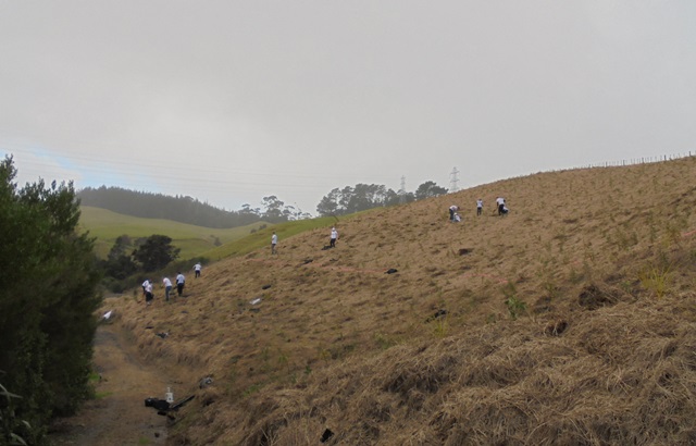 Today we were planting in the steep area near the nursery. Previous groups have been working in the area but there is still a large amount to cover and the group went to work filling in gaps and extended the planted area. It was challenging planting because the ground is steep and uneven and also covered with a thick layer of dead kikuyu grass.