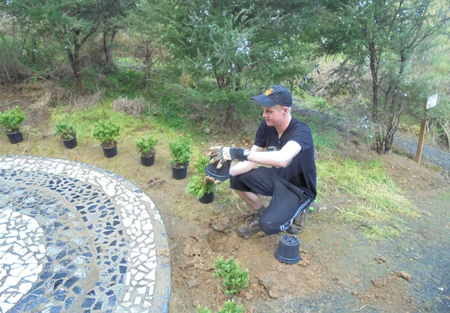 One of the earliest projects undertaken during a gold award residential was a large mosaic of the DoEHA logo at the entrance to the Grove.  Several teams have worked to improve and finish off the mosaic and during the last residential in April it was largely completed.  The remaining task was to clear up the area around the mosaic and do some nice landscaping with native shrubs.