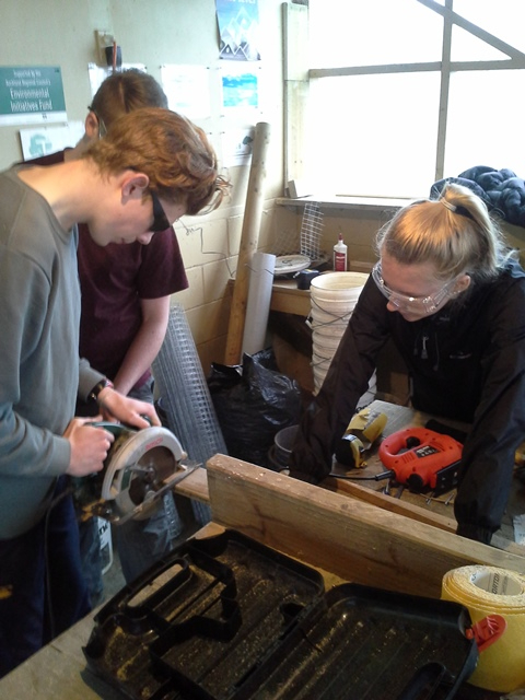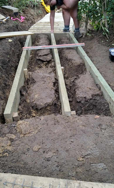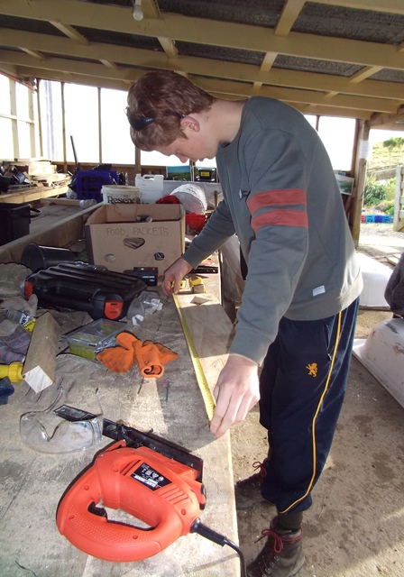 First they had to dig out channels for the footer boards and measure and cut the boards.