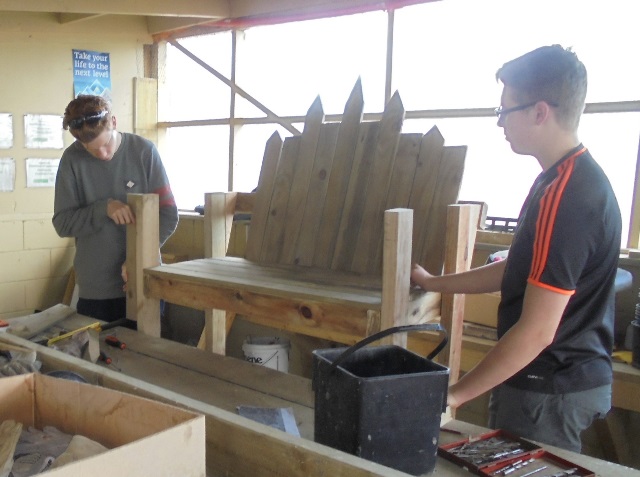 The team decided that the back rest of the bench should look like the crown of the DoEHA logo and so they cut out designs in the wood.