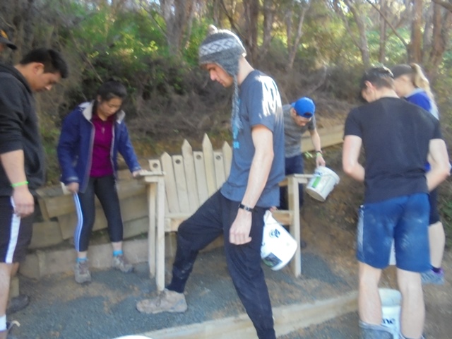 The concrete was allowed to set overnight and the next morning the entire team went up to fix up the gravel around the bench.