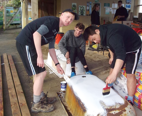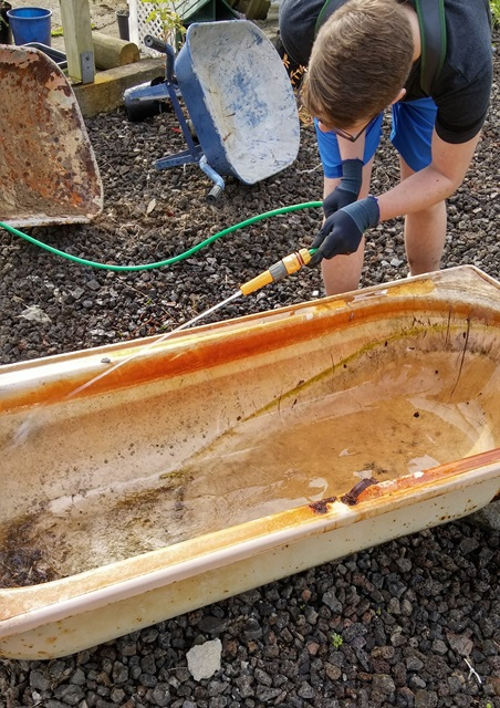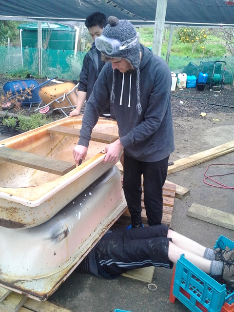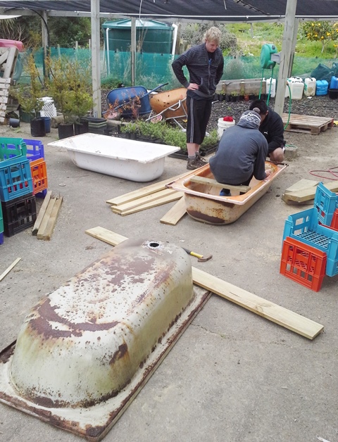 When CUE Haven was a farm, old bathtubs were used as water troughs for the stock. There are still a few tubs around the property and while exploring, the team spotted four of them and brought them down to the nursery/workshop. They decided that two of them bolted together would make interesting picnic tables.