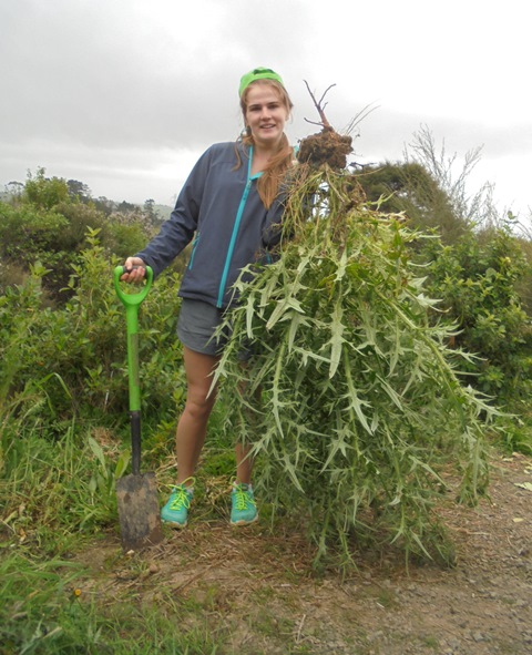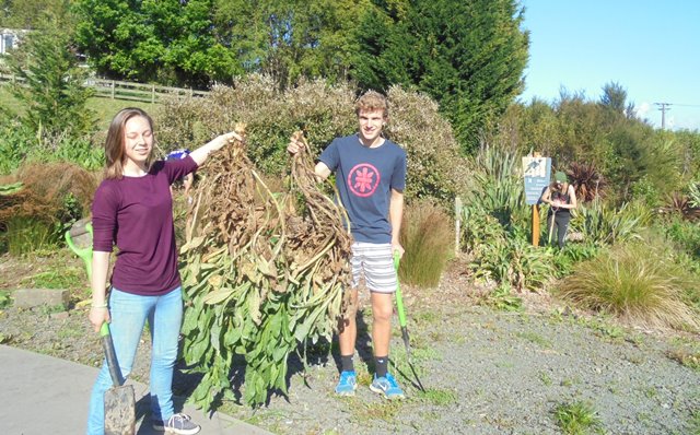 Because it is springtime, the trees at CUE Haven are starting to grow nicely. But the weeds are right behind them and we asked the team to do some weeding in areas that are difficult to spray. It was a messy job but the group kept smiling and got a lot done and made some major improvements in the appearance of the area around the cottage, orchard and along the walking tracks.