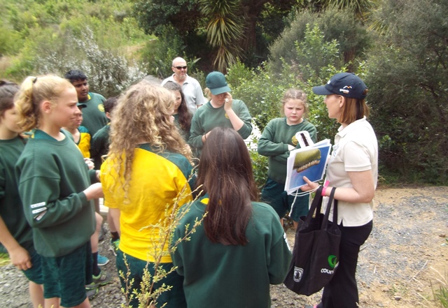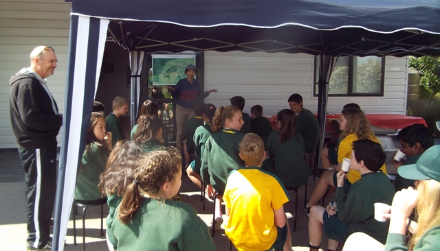 Thomas then gave a short talk about the problem of introduced mammal pests—specifically that as far as many native New Zealand plants and animals are concerned, introduced pests are at the top of the food chain. He showed them a puriri tree that had been badly damaged by possum browsing but since the possums have been controlled the tree has become a home for kereru which in turn are spreading karaka seeds which provide a further food source for birds.