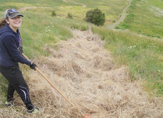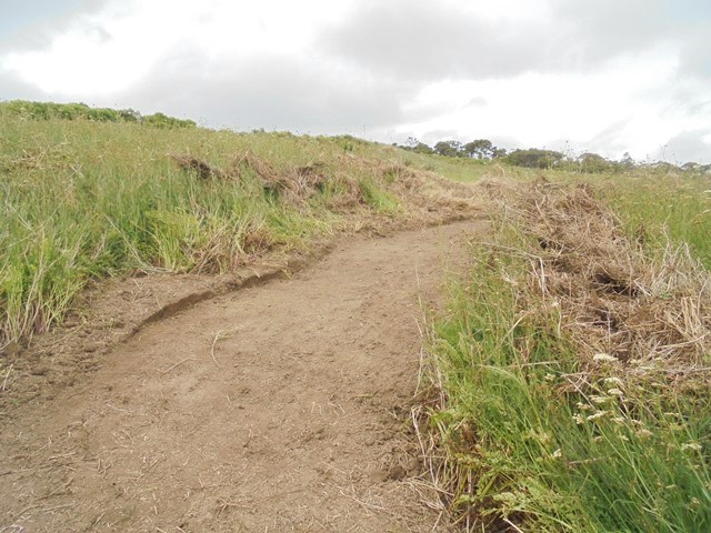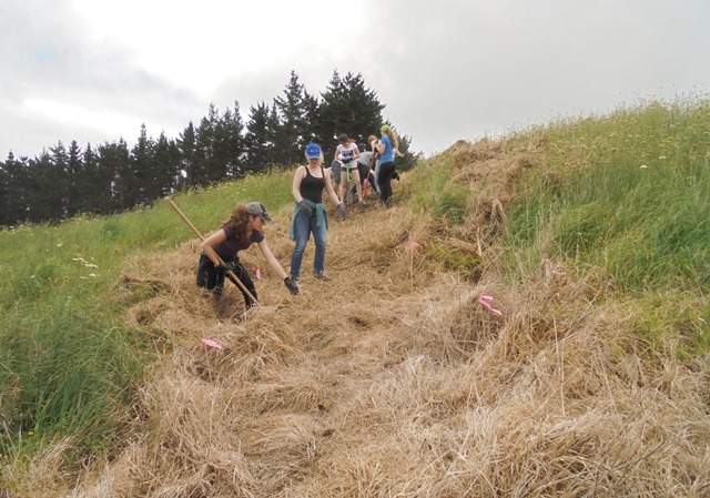 The group then moved along the track with some people using rakes to clear away the dead grass and others following behind with spades to form and bench the track.