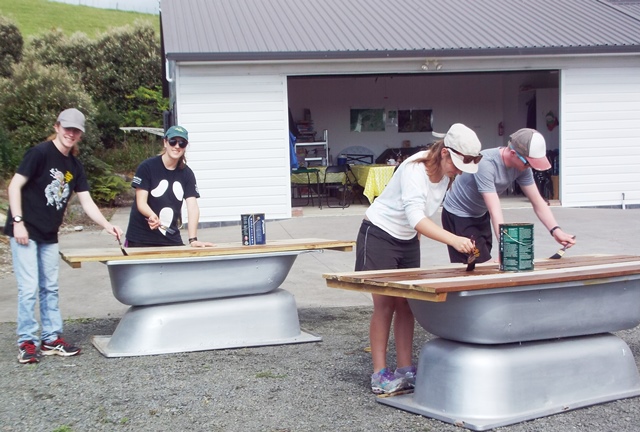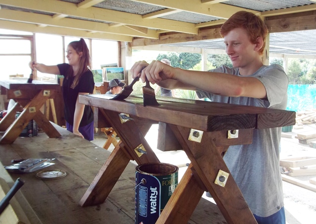 They also stained the long benches and tops of the bath tub tables built by the earlier team to protect them from the weather.