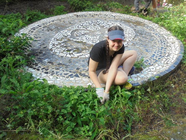 They worked their way down to the bridge near the mosaic. On the other side of the bridge, there was an inconvenient step and then a steep grade up. The team levelled the grade to make it easier to walk up and installed a retaining wall along the edge to prevent slips and erosion.