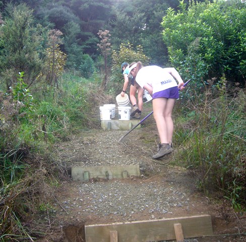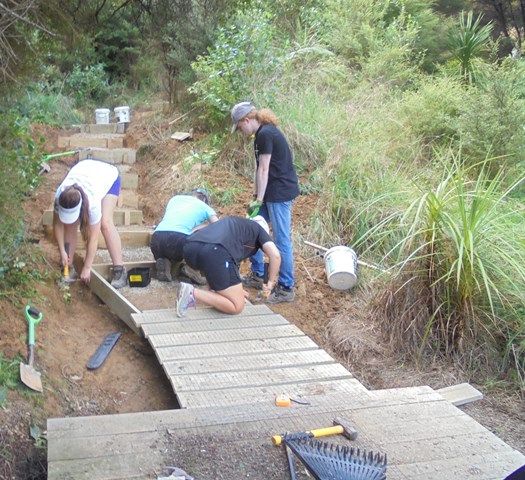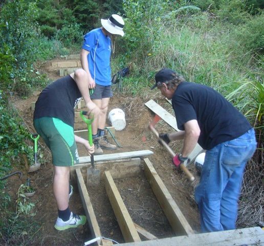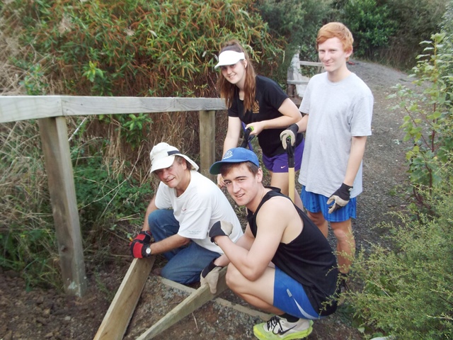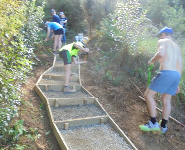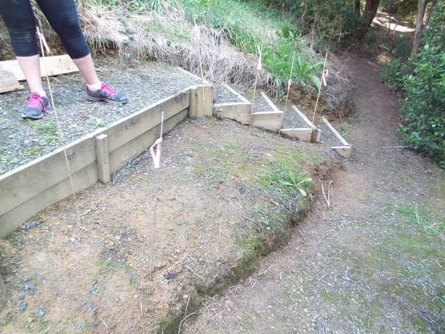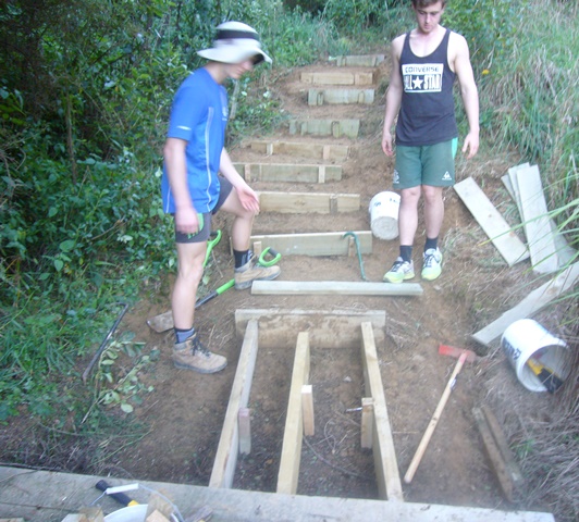 The team started at the top entrance to the DoEHA track, an area that most visitors use. The main effort here was boxing up the sides of the steps to prevent erosion.