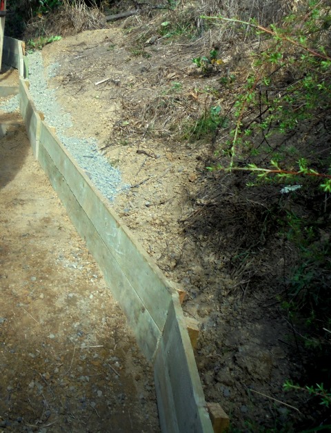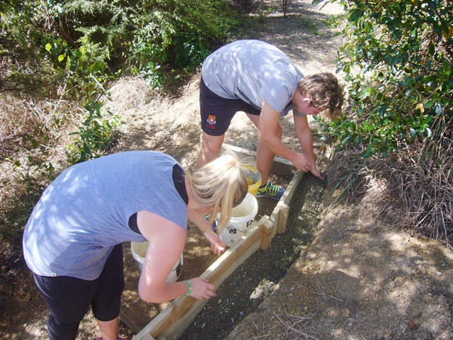 The team then moved to a different part of the property to fix a different track problem. A track near the wetlands had been built along steep ground and during the summer when the wall of the track dried out, it tended to crumble and collapse onto the track surface. As a result, the team dug out the bank and built a retaining wall to secure the bank. Like other track efforts this one involved a lot of digging and hammering but the result is worth it.
