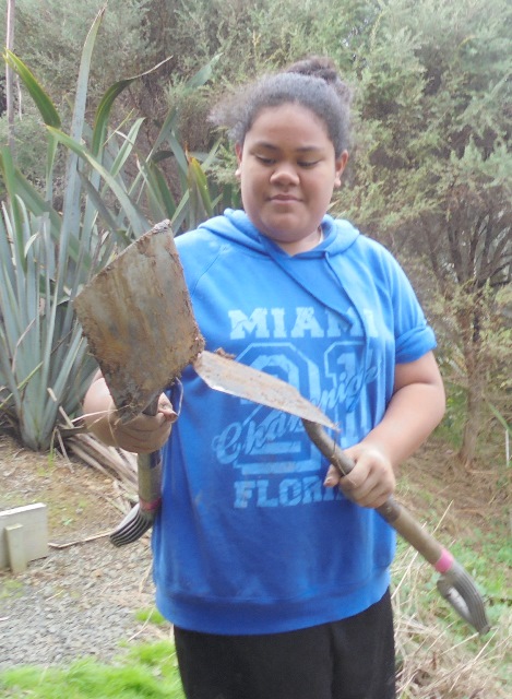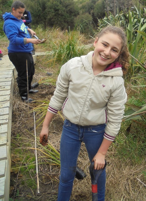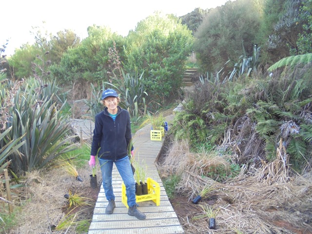 Gail Farrell, TFS coordinator, had arrived earlier and laid out the flax, cabbage trees and cypress for the students to plant.