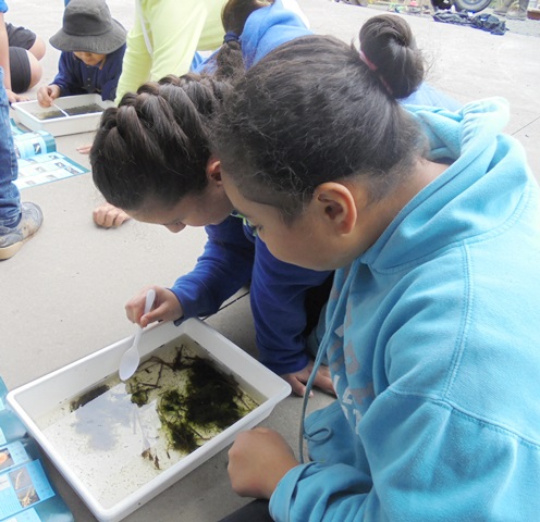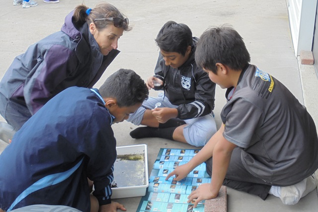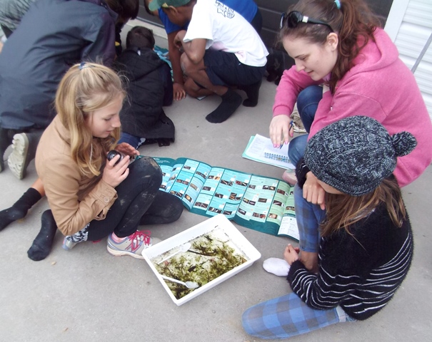 Rachel and Shelley laid out trays of samples and charts with pictures of the different kinds of creatures the students might find.