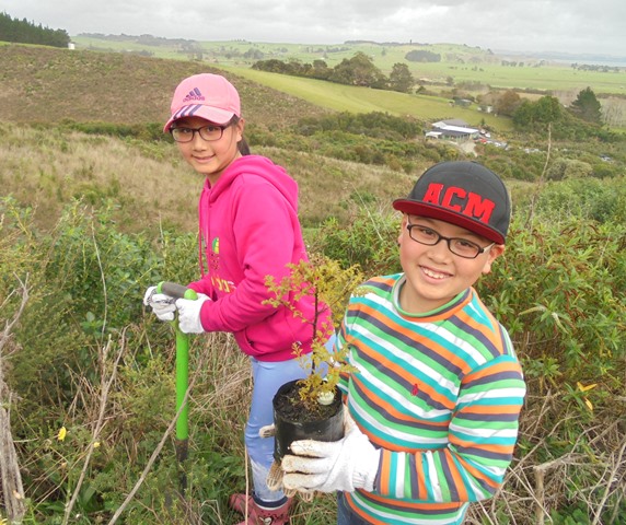 Today’s planting was also significant because we were planting canopy trees in amongst the pioneer trees that several members of the Overseas Chinese Association had planted during their first visit to CUE Haven in 2014. The group was impressed at how much their trees had grown and today they planted the long living canopy trees – totara, rimu, tanekaha, miro, kahikatea and pukatea.
