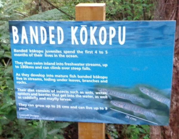 After the initial find of banded kokopu, Louise Thacker, a graphic design student at Unitec designed a very informative sign about these fish. Thanks to funding from the Auckland Council’s Rodney Environmental Education Fund and Capitol Sign Services Ltd, we developed Louise’s design into an actual sign. The information sign enable visitors to CUE Haven to learn more about our native fish.