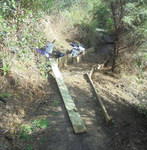 In this area the steps were wearing out because people were taking a short cut. The team shored up the sides of the steps and even came up with the idea to plant trees to prevent future trampers from short cutting the corner.