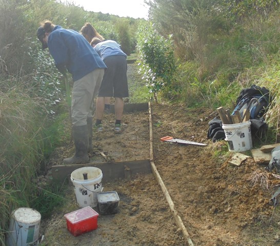 Brigid, Catherine, Kyle and Virginia tackled a section of track near the wetlands to fix some erosion problems by boxing in steps and track sections and also building a small retaining wall. There were several sections needing attention.