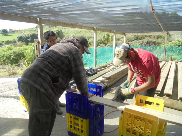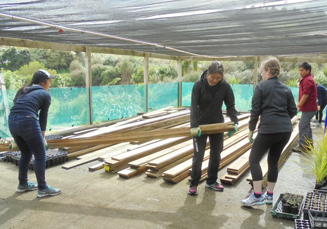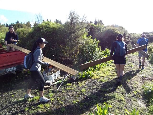 After lunch the weather improved and we took the tour and went to work. We had ordered a supply of timber that the team would be using to box in steps and create retaining walls as part of the track remediation work. Our first task was to move it from the car park into the nursery to keep it out of the elements.
