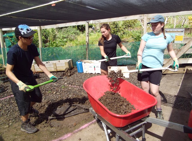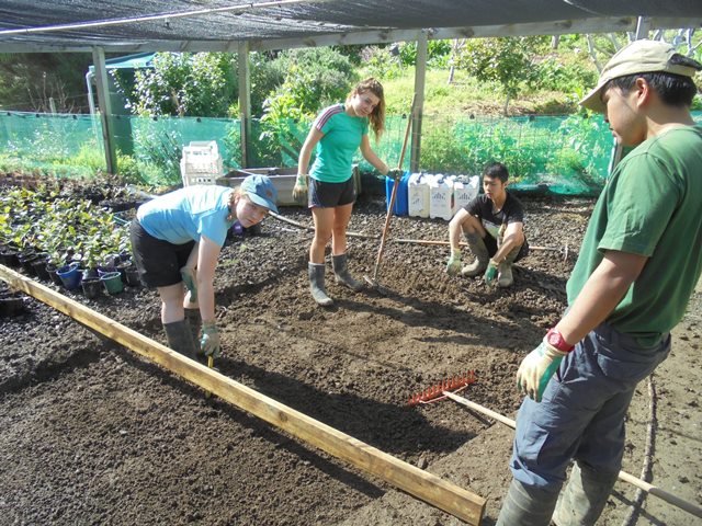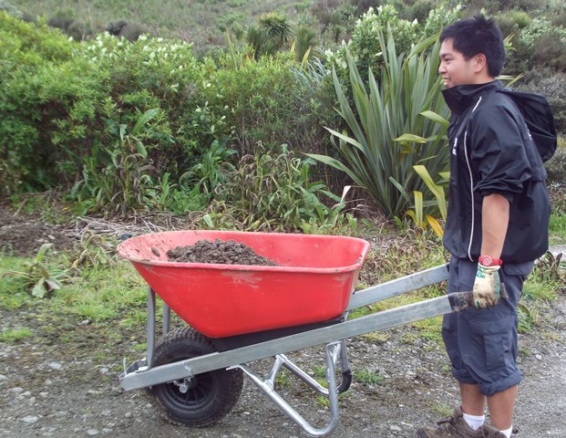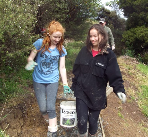 Finally, everyone helped spread gravel on the newly fixed sections to make the track safe for all weather use. We loaded up buckets of gravel and took them up to the track sites for spreading.