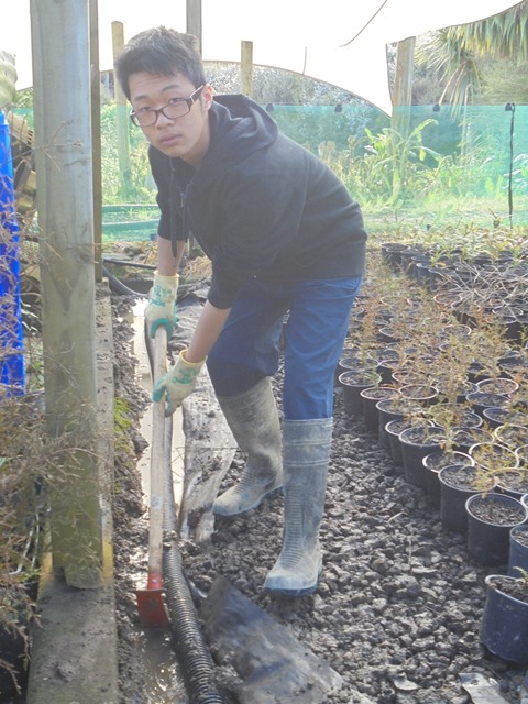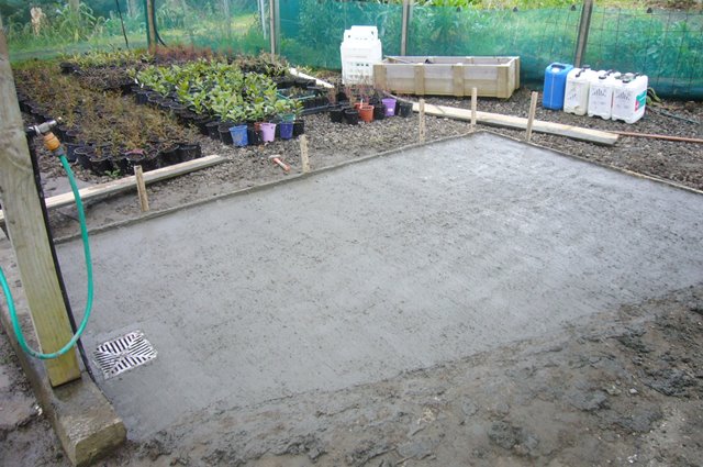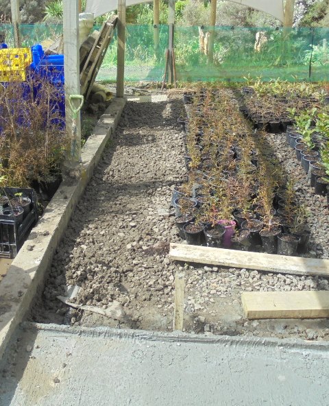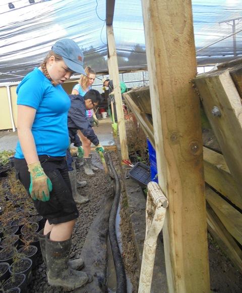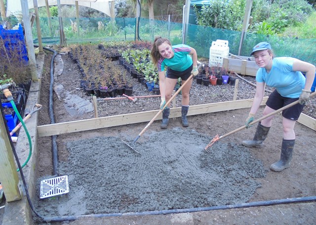 The concrete was allowed to set overnight and the next task was to install the pipe connecting the drain on the platform to the sump at the end of the nursery, which would channel the water out of the area. The challenge was determining that there was sufficient downward slope so that the water would flow and it required a bit of digging to get it right.