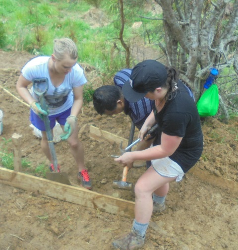 The last project the team worked on was to finish off a new track that we just started earlier this month. The track traverses a steep area and leads to the wetlands. We designed it with a series of switchbacks so that there would be long gentle slopes instead of sections with steep steps. The track had been cleared but we still needed to finish off the retaining and also ensure that the steps connecting the longer sections of track were easy to use.