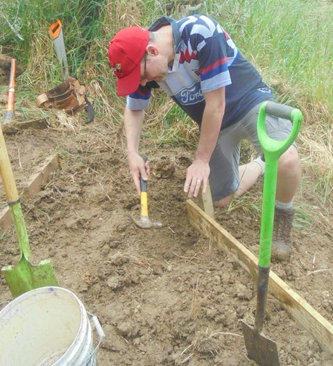 The retaining walls were long planks that were secured in place with pegs and getting them installed involved a lot of measuring, cutting and hammering.