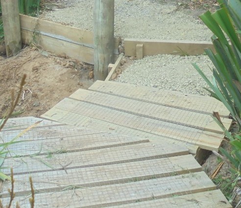 A large portion of the Lisa’s Wish Grove is in the wetlands and the walking track has been built on both firm ground and one section is a bridge over a wet section. As visitors use the track, we find ways to improve it and the two things we wanted to accomplish this weekend were (1) fixing the steps at the entrance to the Grove to make them easier to use and (2) extending the boardwalk bridge to link up to the existing wetlands boardwalk and to eliminate an inconvenient step.