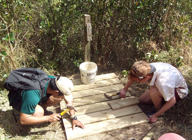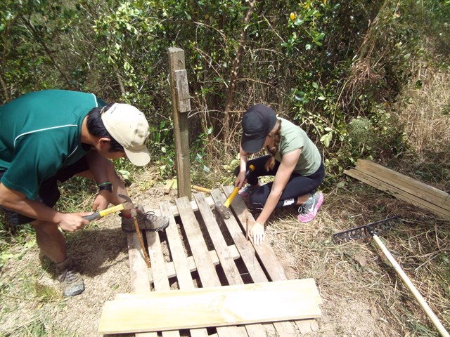 Some of the steps on the older parts of the walking track were made 500mm wide instead of 1000mm which is our current standard. In order to make all of the track sections uniform, we have been widening existing steps. To conserve timber, rather than removing the existing step timber, we have chosen to add side pieces to each step.
