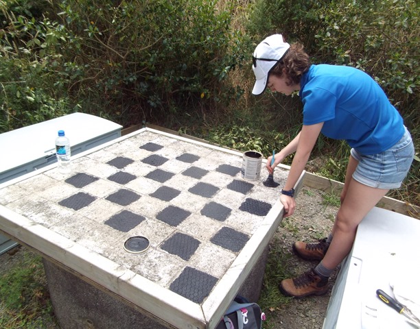 Earlier teams had built a large chessboard, complete with chess pieces and checkers up behind the DoEHA hut. The chessboard was made of concrete and the black squares were made by embossing a design in the wet concrete. Over the years because of the weather, the pattern was getting worn away and we decided to paint he squares so that they would show up better.