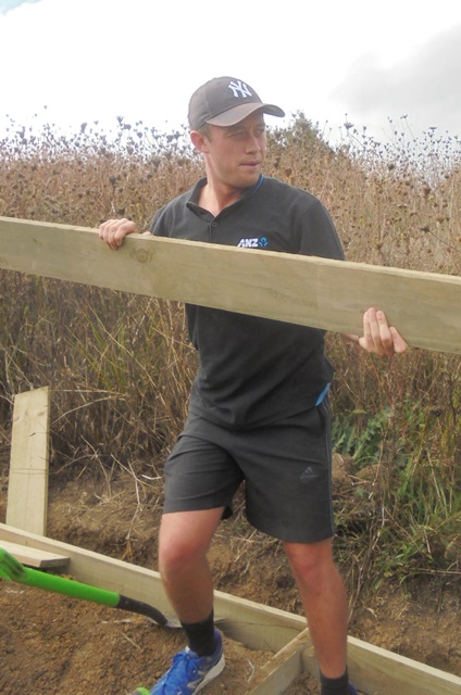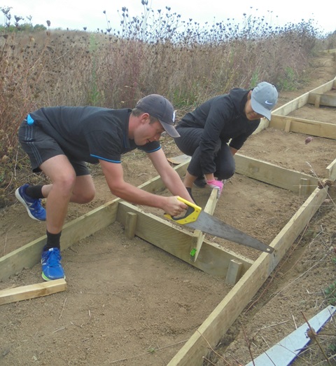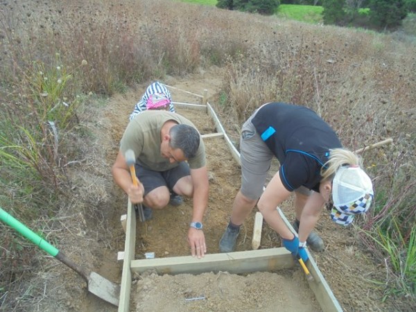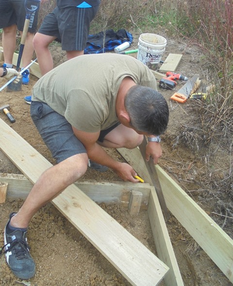 The work involved a lot of measuring, digging, sawing and hammering. The first step involved studying the line of the long section of track and cutting away any eroded soil to make a firm foundation for the retaining boards.