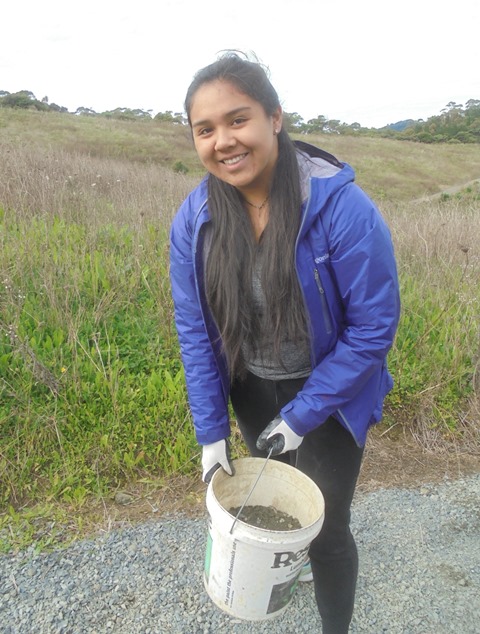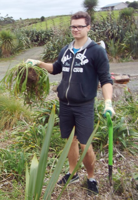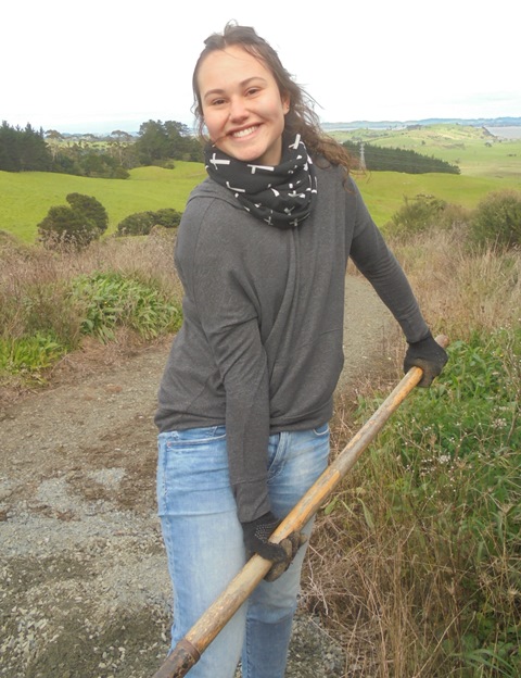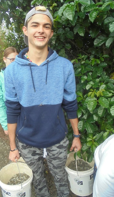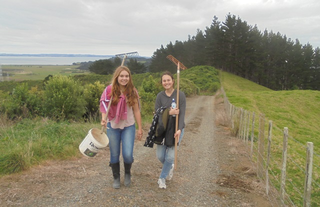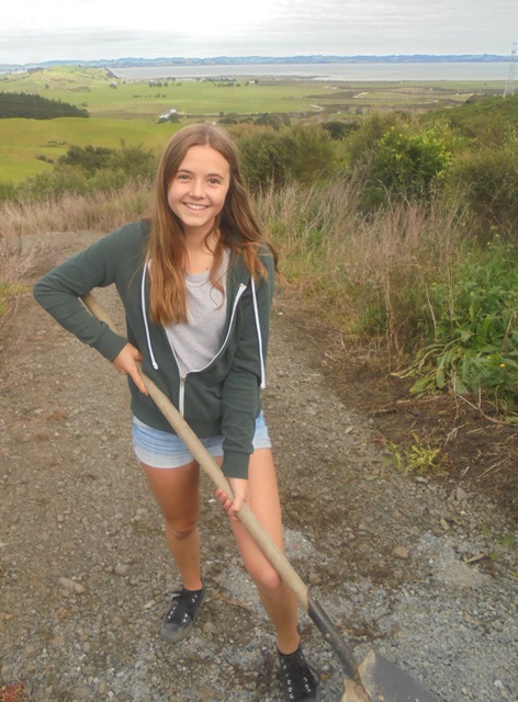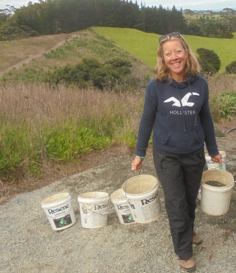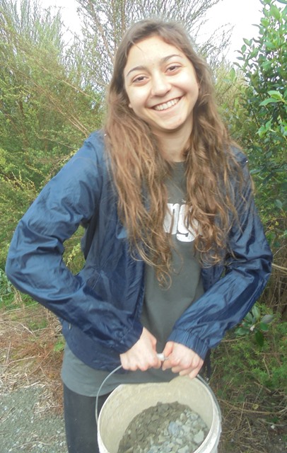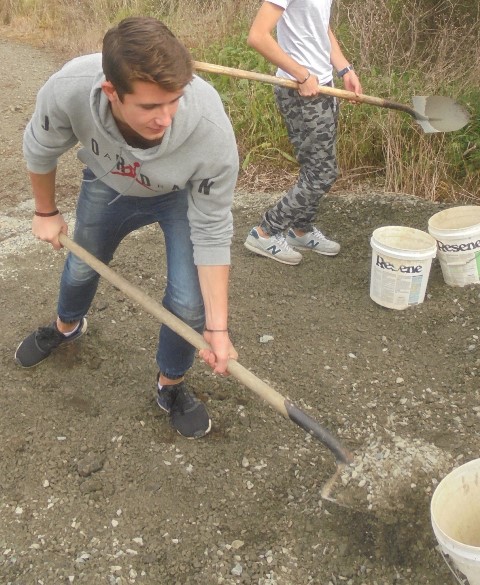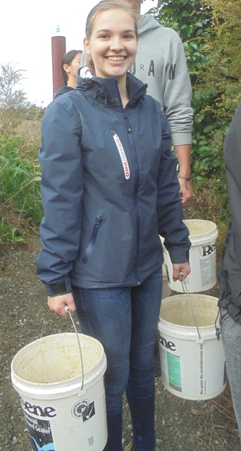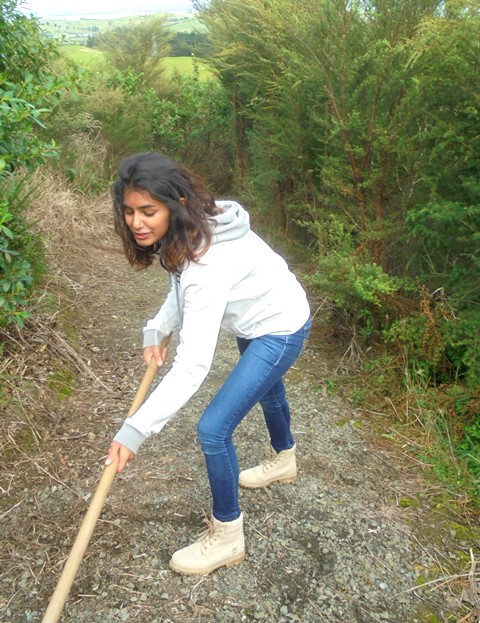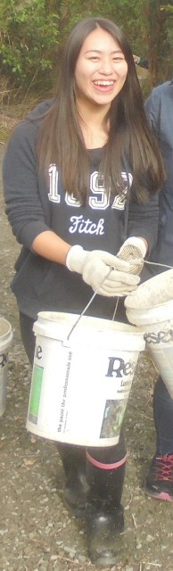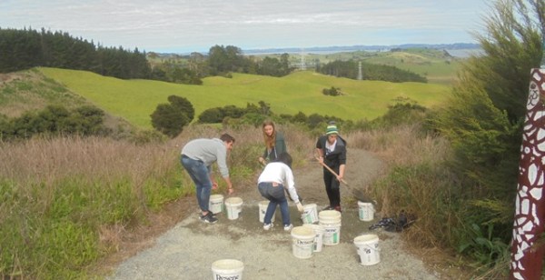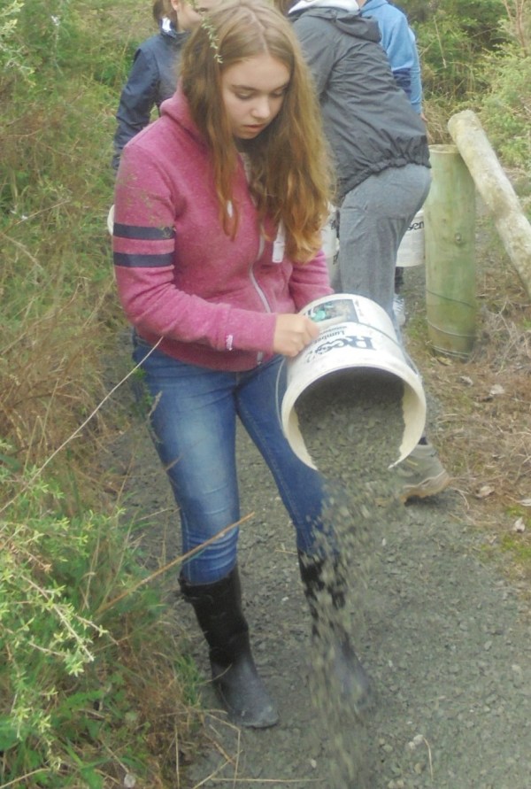 While one group was weeding, the other team went up to the top of the property to work on the track. We had earlier put a pile of gravel at one end of the track and the work involved shoveling gravel into 10 litre buckets which were then carried to the track and dumped.