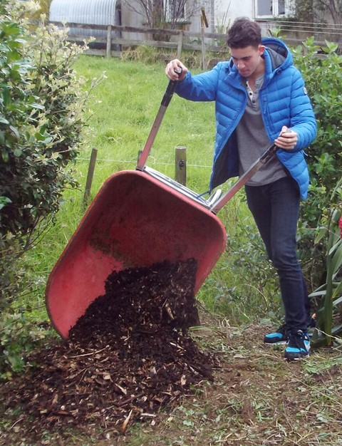 Once an area was clear of weeds, we could put down the mulch. This involved shoveling it into a wheelbarrow and bringing it to the site.