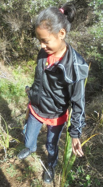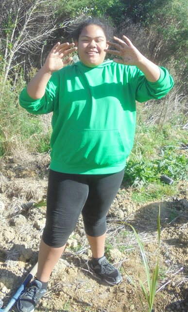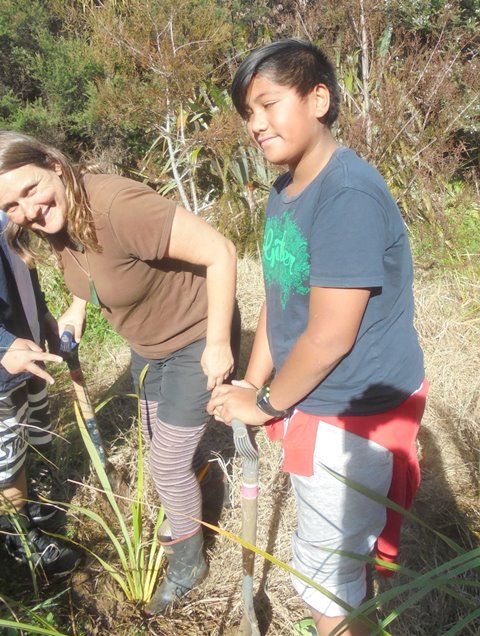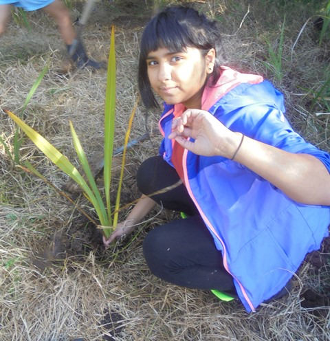 Gail Allende of Trees for Survival was on site to manage the planting activity and had laid out the plants for the students. Hazel and Libby, Auckland Council’s Sustainable Schools environmental educators joined us to give the students a study session on water quality and macroinvertebrates.
