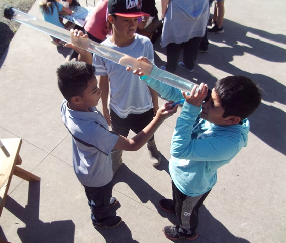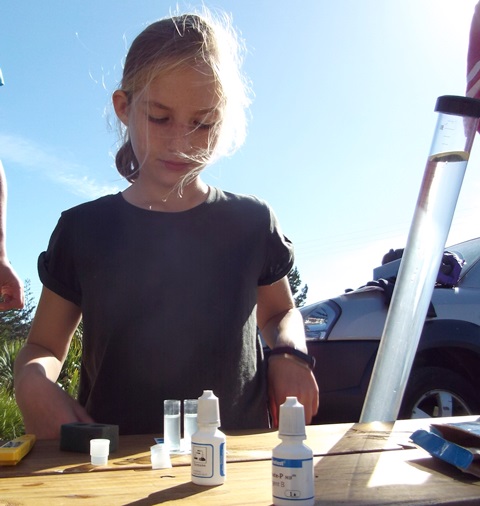 Water clarity testing involved looking through a tube filled with water and measuring the distance light can penetrate. It is a test that requires teamwork.