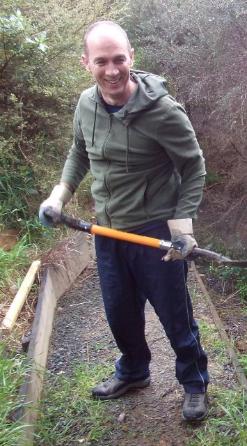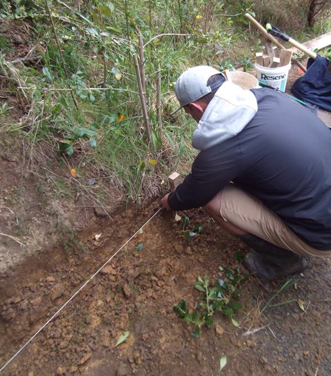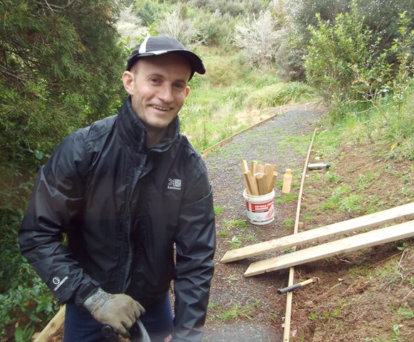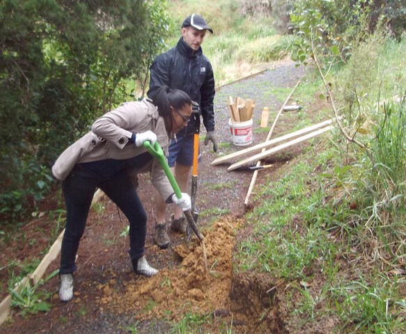 After wet winter weather, the walking tracks at CUE Haven need a lot of maintenance work. Heavy winter rains also show us where drainage or track structure need to be improved. There is one stretch of track near the wetlands that runs along a steep slope. As a result, the track had to be cut into the side of the slope and retained on both sides to prevent erosion. There were a few small slips over the winter and we identified a number of areas where the track benching and retaining needed to be improved. The plan for the day was to fix as many of those areas as possible and there were a lot of challenges because each track section presented a slightly different issue.