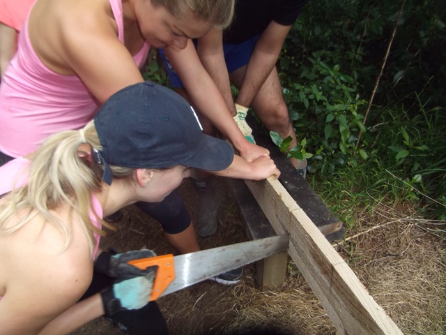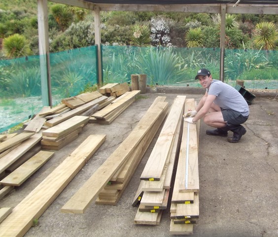 We found a big old shipping pallet in the nursery that could be used as the foundation for a bigger, stronger bridge and also measured up and cut the timber that would be used to construct the bridge.